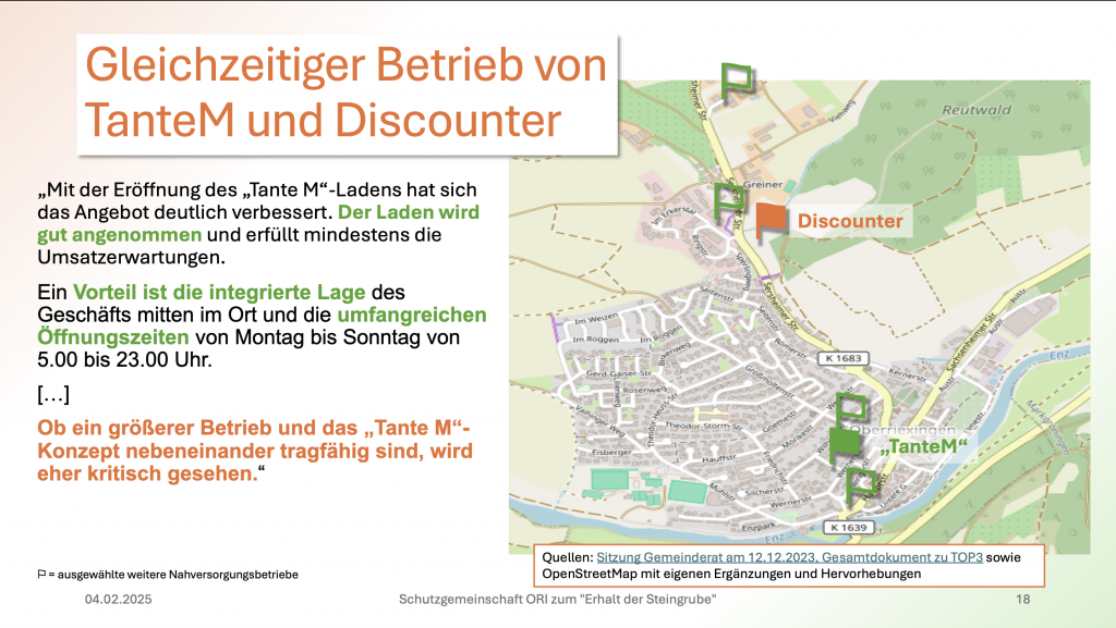 Ein gleichzeitiger Betrieb des bereits vorhandenen „TanteM“-Ladens und des angedachten Discounters ist – laut Beschlussvorlage zur Gemeinderatssitzung am 12.12.2023 – eher kritisch anzusehen. Der „TanteM“-Laden, der sich in einer integrierten Lage befindet und somit für mehr Einwohner*innen fußläufig erreichbar ist als ein Discounter in der Steingrube, wird scheinbar gut angenommen [Quelle 8].