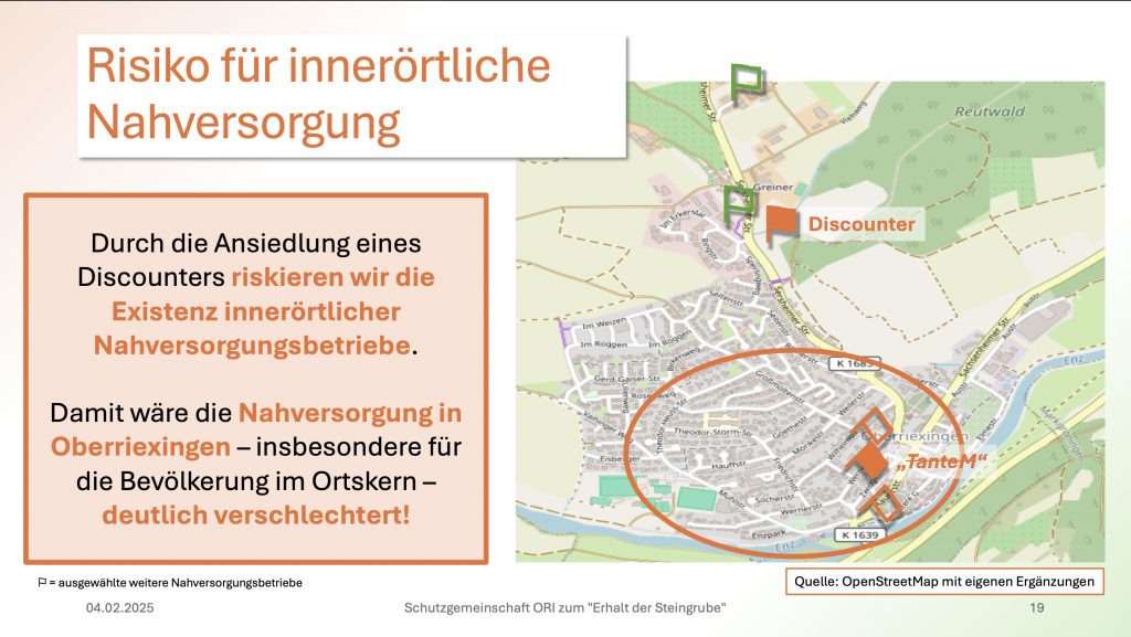 Aus unserer Sicht riskieren wir durch die Ansiedlung eines Discounters die Existenz von innerörtlichen Nahversorgungsbetrieben (wie z.B. des „TanteM“-Ladens). Die Folge wäre, dass insbesondere für die Bevölkerung im Ortskern die Nahversorgung nicht nur nicht verbessert, sondern sogar deutlich verschlechtert würde!